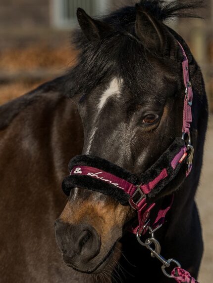 Gevoerd met bont voor extra comfort voor het paard. Het nylon materiaal zorgt daarnaast voor duurzaamheid en voor het makkelijker schoonmaken. De glitters op de neusriem en het kopstuk geven een stijlvolle uitstraling aan het halster.