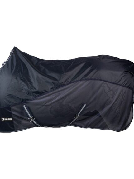 Moderne lichtgewicht regendeken in de kleur blauw. Uitgevoerd met waterdichte top en mesh zijden. Inclusief afneembare hals. Door de goed verstelbare voorzijde ook geschikt voor de paarden met een breder front.