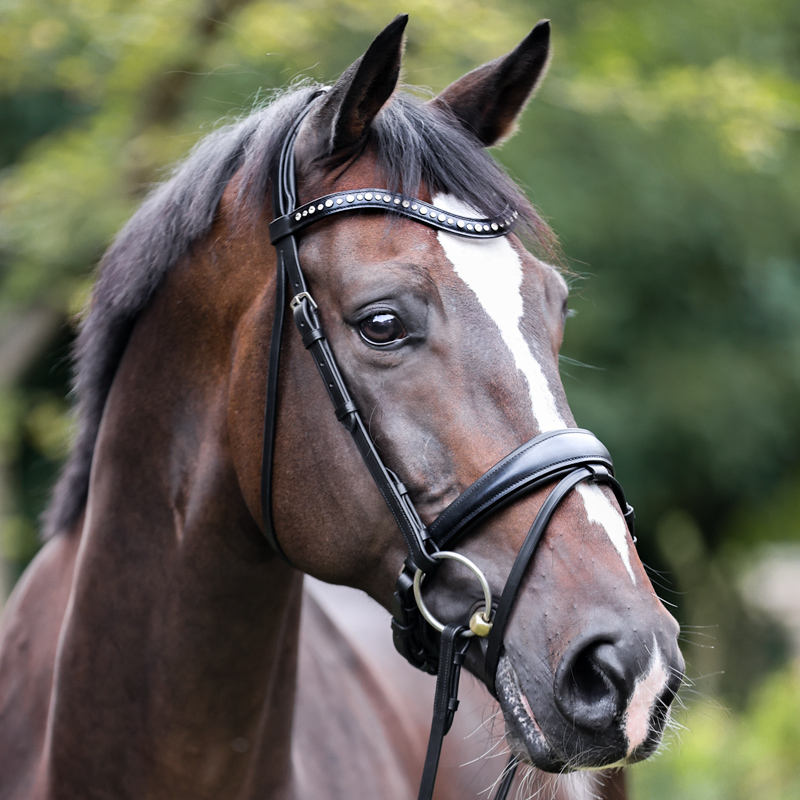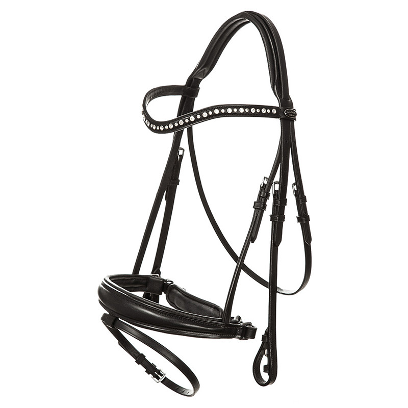 Van soepel leer gemaakt hoofdstel waarbij de bevestiging van de neusriem via de bakstukken over het kopstuk loopt, voor de drukverdeling. Het kopstuk en de sperriem zijn zacht onderlegd, waarbij de sperriem naar de zijkanten toe smaller wordt. De frontriem is gebogen met ingelegde witte strass-steentjes. Inclusief rubberen teugels met stops.